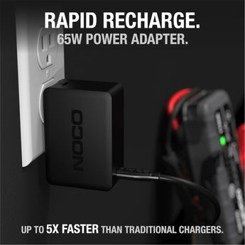 The U65 65-Watt USB-C Charger is designed for recharging NOCO Boost X Lithium Jump Starters. Engineered to safely and efficiently recharge GBX45, GBX55, GBX75 and GBX155 up to five times faster than traditional USB wall or car chargers.