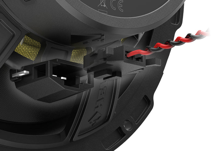 Speakers with our FlexConnect terminal can easily be connected directly to the original wiring harness of the vehicle, maintaining the automotive standard of the plug connection as well as guaranteeing reverse polarity protection. Accordingly, there’s no need to cut any cables or damage any of the original equipment. Similar to our FlexMount system, this technology relies on specially developed, vehicle-specific adaptors.