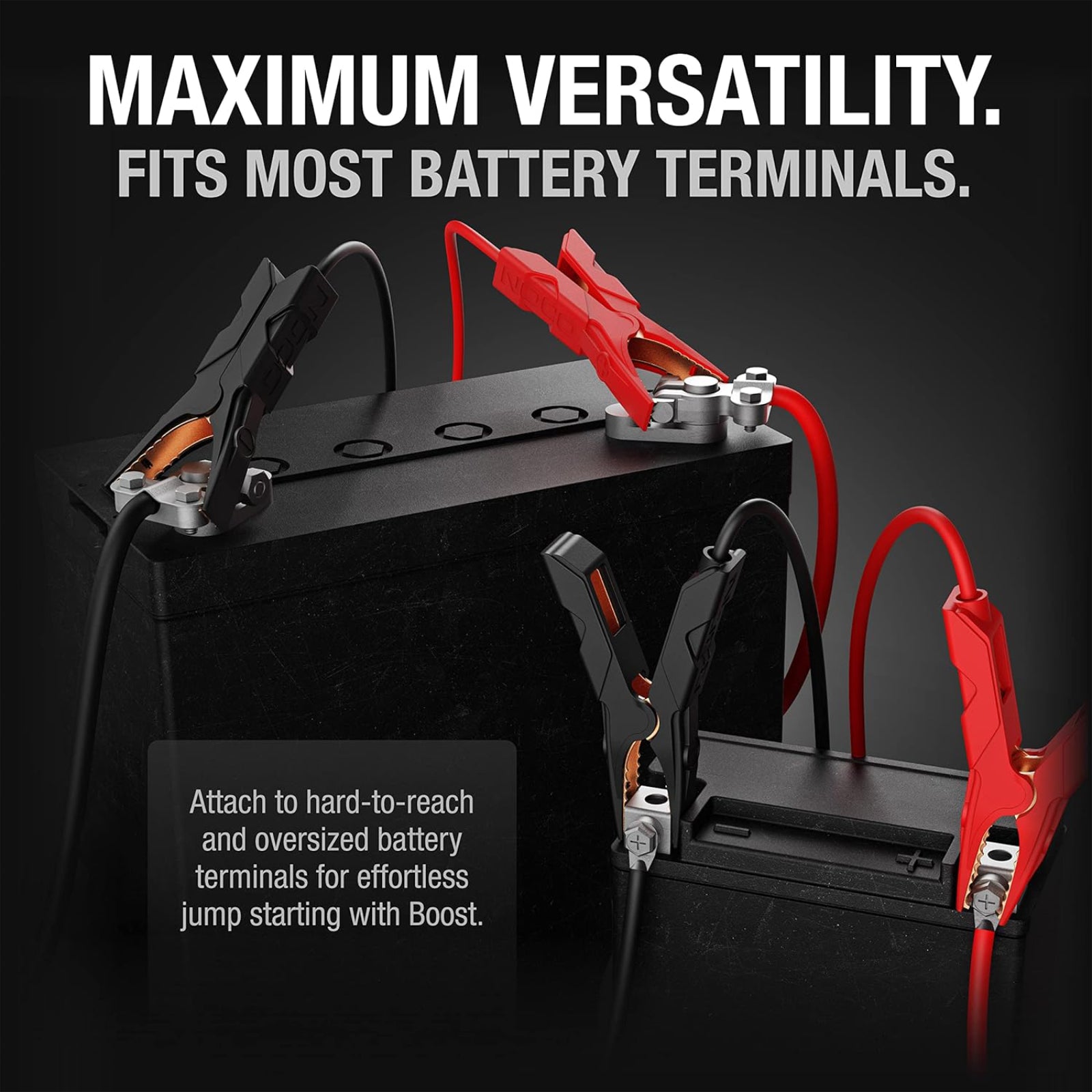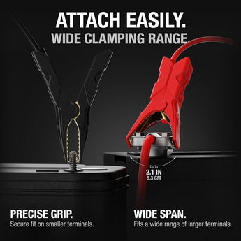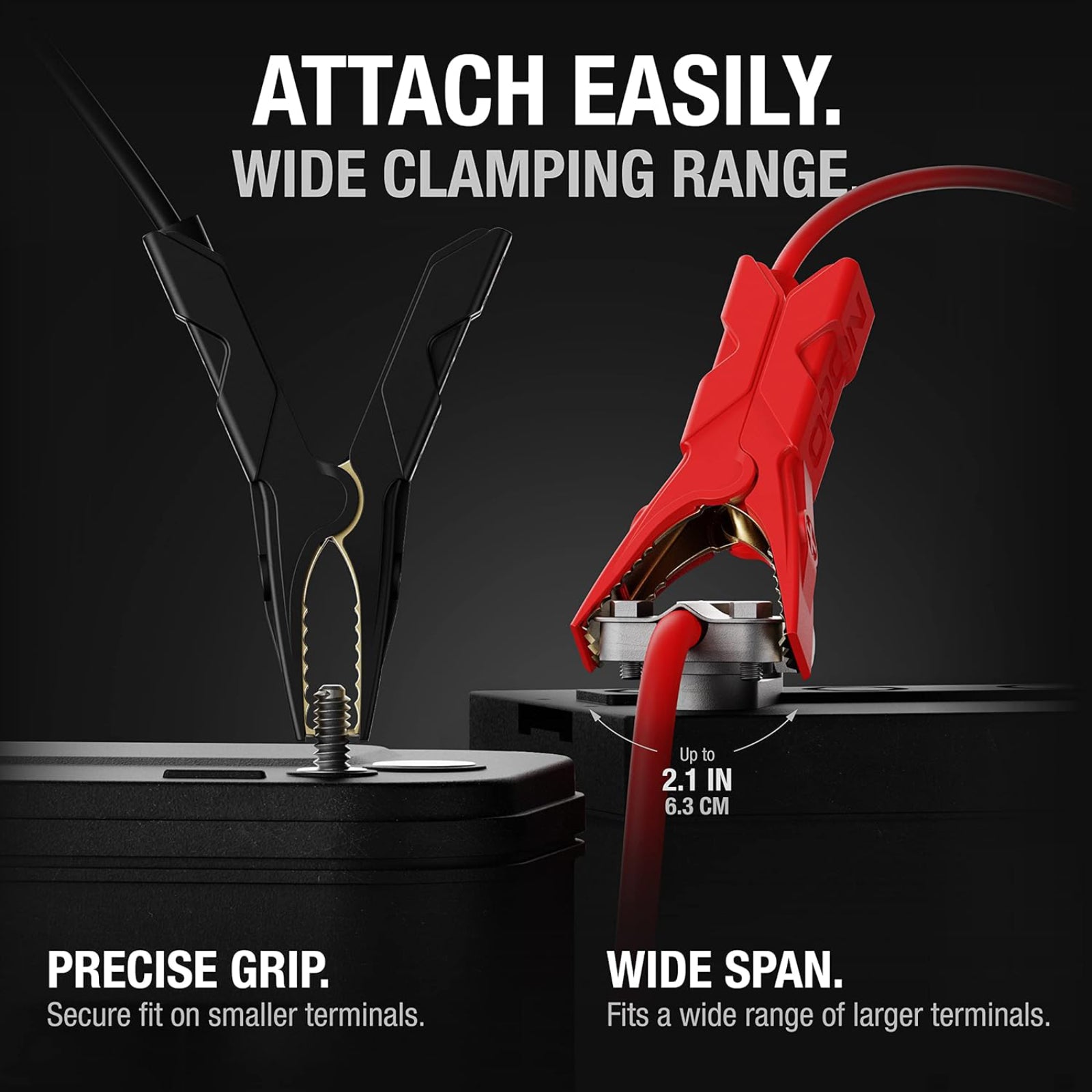 Heavy-duty battery clamps designed for both 12-volt gas and diesel engines. Compatible with GB20, GB40, GB50 and GBX45 NOCO Boost UltraSafe Lithium Jump Starters.