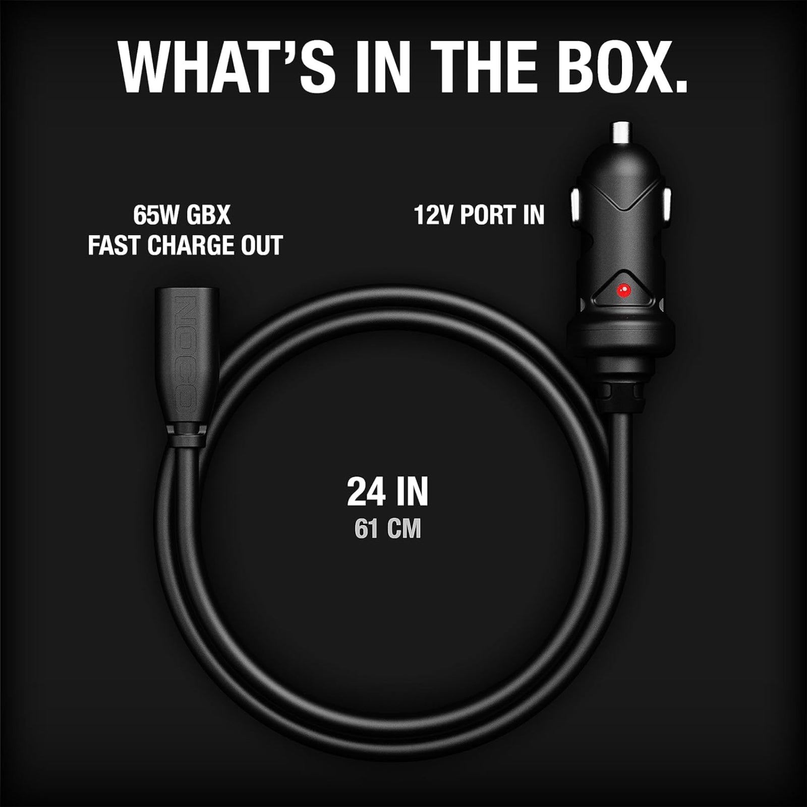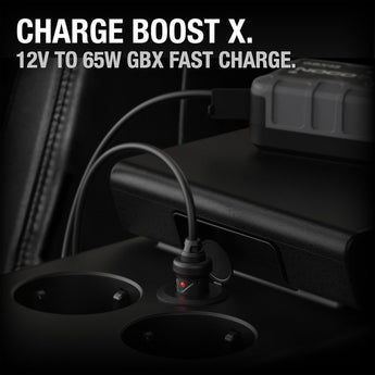 The NOCO GBC011 65W GBX 12V Car Charger connects directly to the NOCO Boost X jump starter's USB-C IN/OUT ports. Easily charge all Boost X models including the GBX45, GBX55, GBX75, and GBX155 through 12-volt and 12-volt mini auxiliary ports in a fraction of the time with up to 65W USB-C power delivery. A built-in power LED indicator illuminates when the vehicle's 12-volt is active.