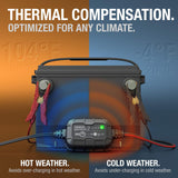 A multi-functional design that allows you to charge in more ways. Effortlessly charge multiple battery voltages (6-Volt and 12-volt lead-acid and lithium-ion batteries) chemistries (Flooded, gel, maintenance-free and AGM batteries) and types (Starter, deep-cycle, marine, powersport and more).