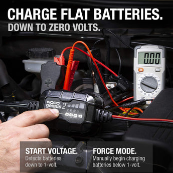 The all-new start-voltage sensor allows the GENIUS to detect and charge dead batteries as low as 1-volt. For extremely dead batteries lower than 1-volt, manually turn on force mode to detect and charge batteries all the way down to zero volts.