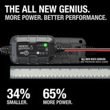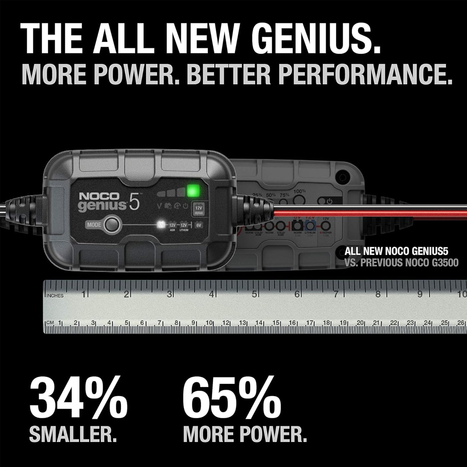 Introducing the all-new GENIUS5, one of our most powerful, highest-performing, energy-efficient, and compact chargers yet. The GENIUS5 is a 6-volt and 12-volt battery charger, battery maintainer, and battery desulfator rated at 5-amps for lead-acid automotive, marine, and deep-cycle batteries, including flooded, gel, AGM, and maintenance-free, plus lithium-ion batteries.