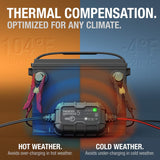 A multi-functional design that allows you to charge in more ways. Effortlessly charge multiple battery voltages (6-Volt and 12-volt lead-acid and lithium-ion batteries) chemistries (Flooded, gel, maintenance-free and AGM batteries) and types (Starter, deep-cycle, marine, powersport and more).