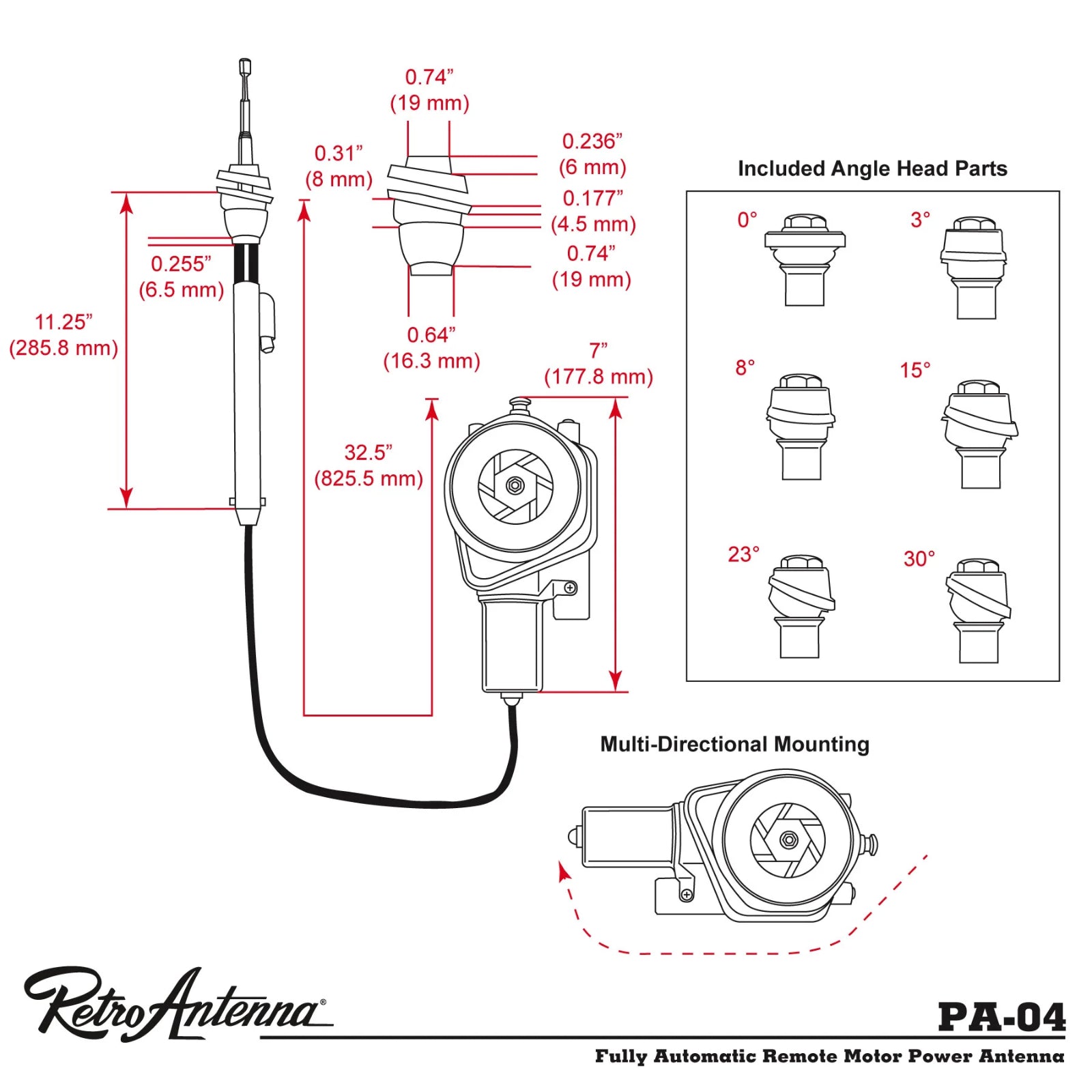 RetroSound PA04 Fully Automatic Electric Power Antenna Aerial and Mounting Heads