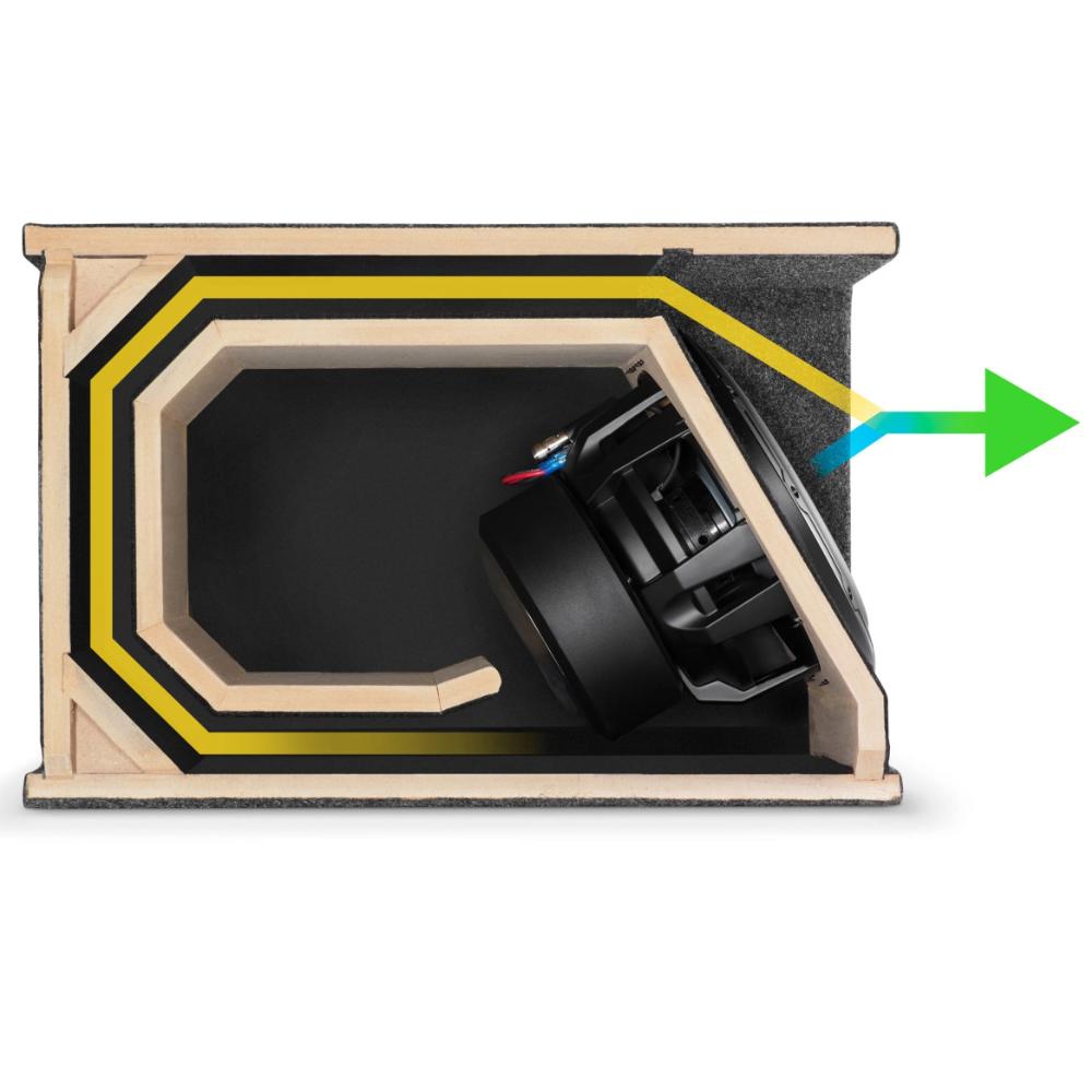 JL Audio's patented, chamber-coupled port design (U.S. patent #6,625,292) wraps around the inner enclosure boundary and terminates just above the woofer, coupling the port output to the woofer's direct output. This also provides the necessary surface area and port length to maximize the performance of the W6v3 driver. This enclosure design has been carefully engineered to the optimum ported alignment for the 10W6v3, and has been fine-tuned through extensive real-world listening.
