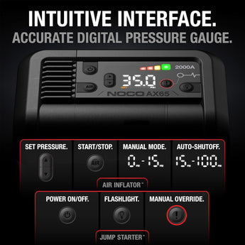 Introducing the AX65, the ultimate all-in-one portable jump starter, tire inflator, and flashlight engineered to be your essential car accessory and emergency roadside companion. With 2000 amps of power, the AX65 effortlessly jump starts everything from cars and motorcycles to SUVs and tractors, handling engines up to 8.0-liter gasoline and 6.0-liter diesel with ease. AX65 is the next generation of portable air compressors, utilizing advanced motor and airflow design in an unbelievably compact form with uncompromising performance, it runs longer, fills faster, and is infinitely better.