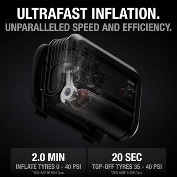 Experience the unparalleled speed and efficiency of a 280-watt motor seamlessly inflating tires from 0 to 40 PSI in an astonishingly swift 2.0 minutes at 67 LPM (Liters Per Minute). Or quickly top off (35-40 PSI) low tires in less than 22 seconds.